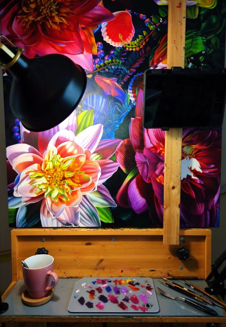 "Meine Stillleben stellen einen Dialog zwischen Tradition und Moderne dar. Altmeisterliche Maltechnik trifft auf Künstlichkeit und grelle Farben.